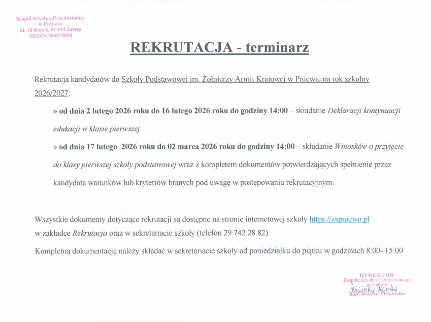 od 7.30 – do 15.30 w sekretariacie Zespołu Szkolno-Przedszkolnego w Pniewie (gabinet 1).