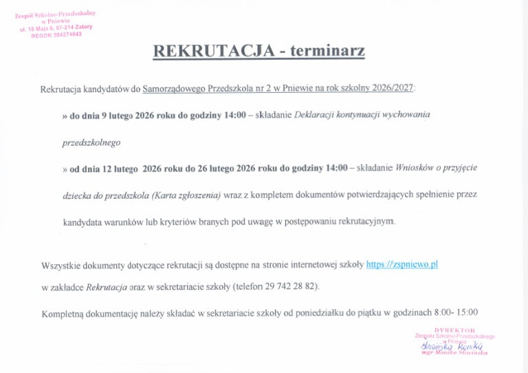 Złożenia deklaracji o kontynuacji wychowania przedszkolnego w oddziałach Samorządowego Przedszkola nr 2 w Pniewie należy dokonać do 09.02.2026r. w godzinach od 7.30 – do 15.30 w sekretariacie Zespołu Szkolno-Przedszkolnego w Pniewie (gabinet 1).